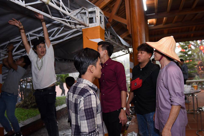 Trận mưa khiến nghệ sĩ Hoài Linh và ê-kíp phải chống dột cấp tốc cho một khu vực trong nhà thờ Tổ.