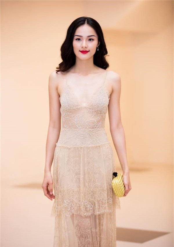 Hạ Vi cũng xuất hiện tại một sự kiện, cô gầy guộc trong chiếc váy 2 dây tông màu nude cổ sâu hun hút.