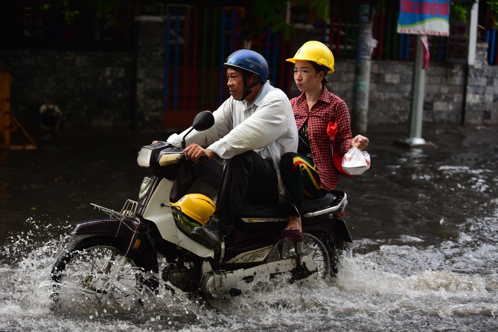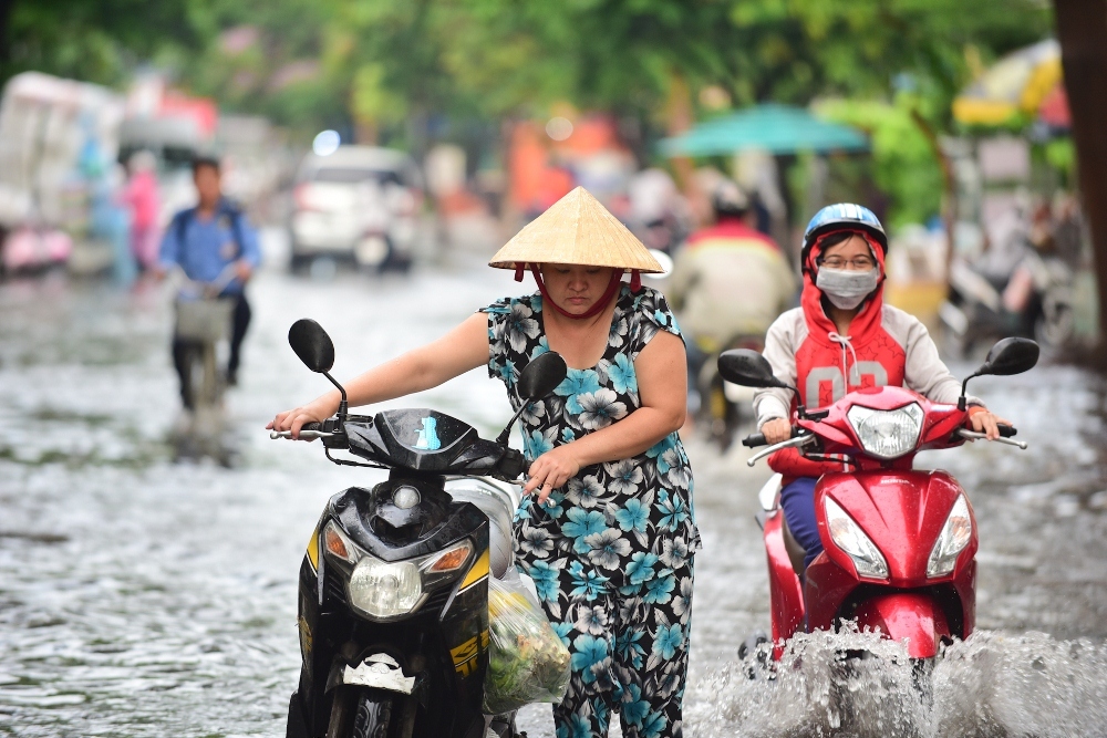 Mưa ngập vào lúc đi làm, khiến người dân vất vả qua đoạn đường đầy nước