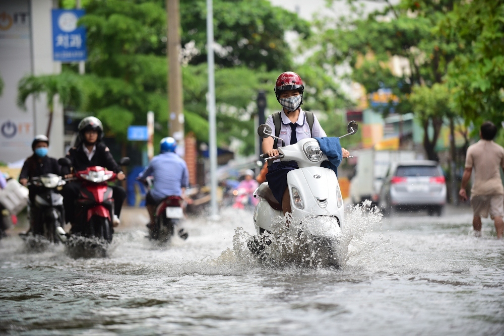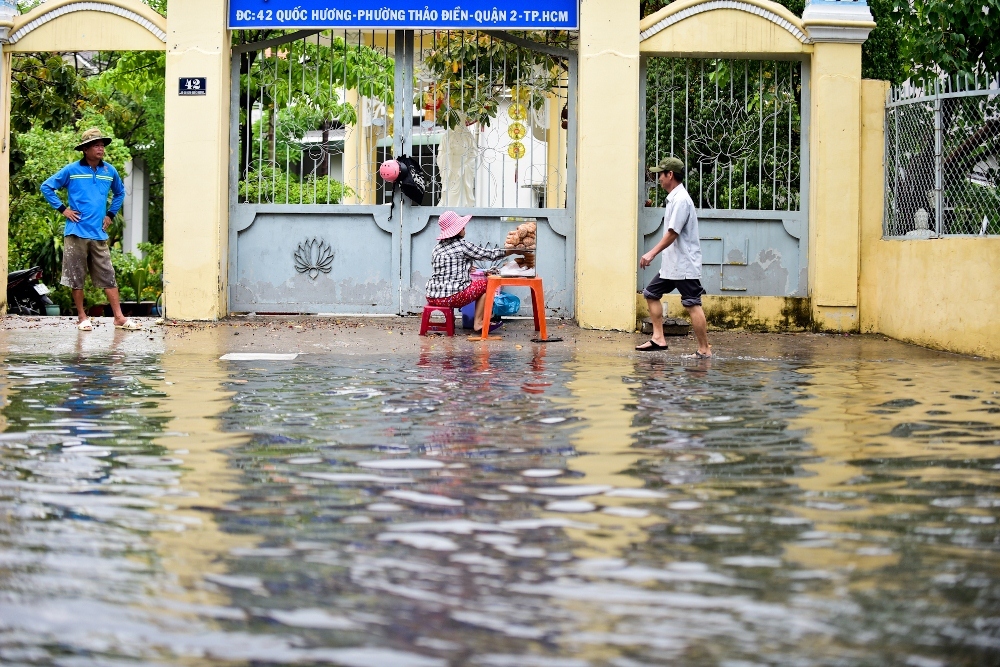 Người Sài Gòn ngã nhào qua đường ngập Quốc Hương, Thảo Điền, quận 2, TP.HCM sáng 17/4