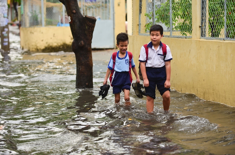 Em Trần Đăng Khoa học sinh lớp 3 trường Tiểu học Huỳnh Văn Ngỡi cùng bạn qua đường ngập đến trường