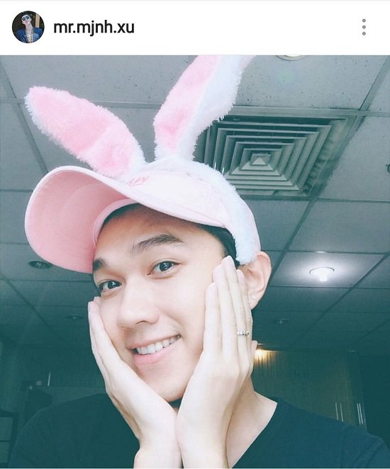 Minh Xù nhí nhảnh chụp ảnh cùng mũ hồng tai thỏ.