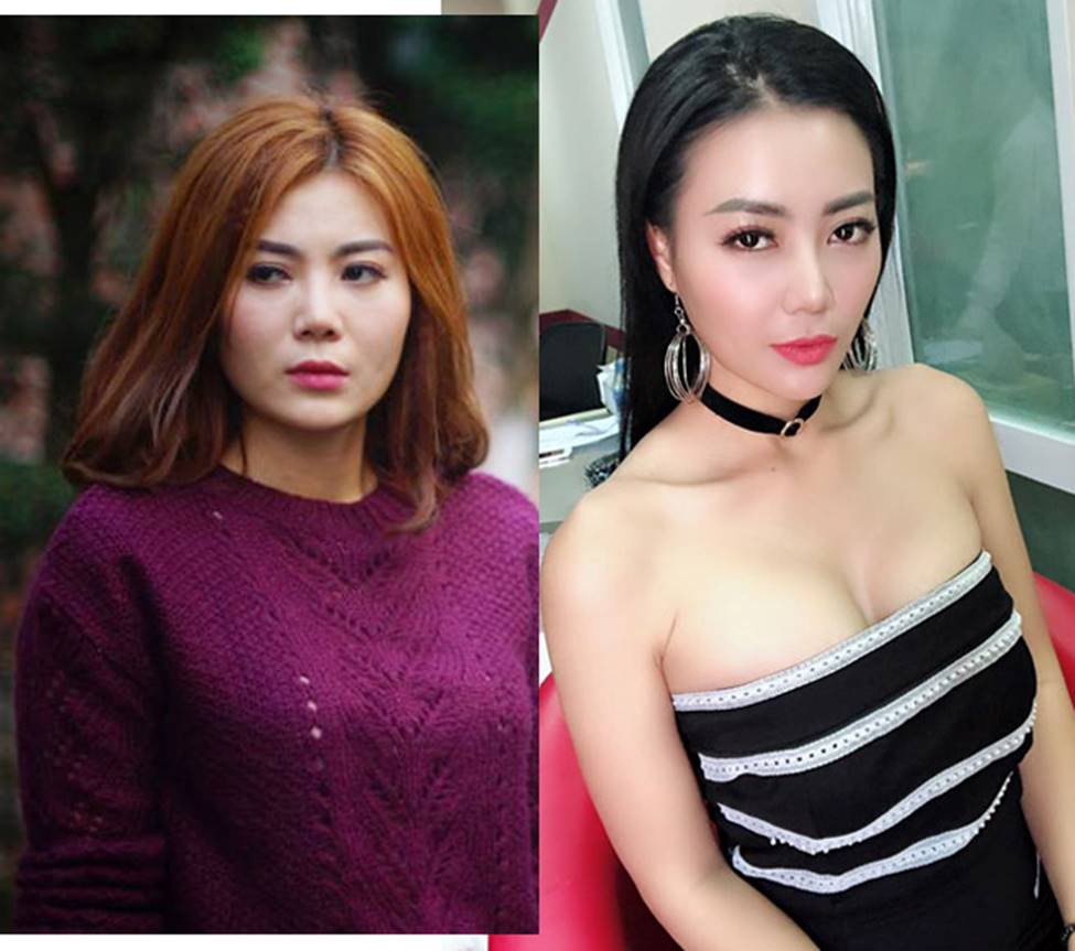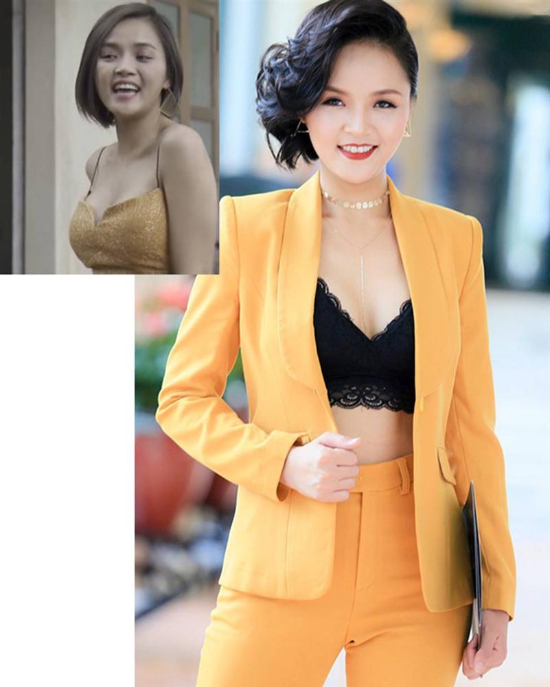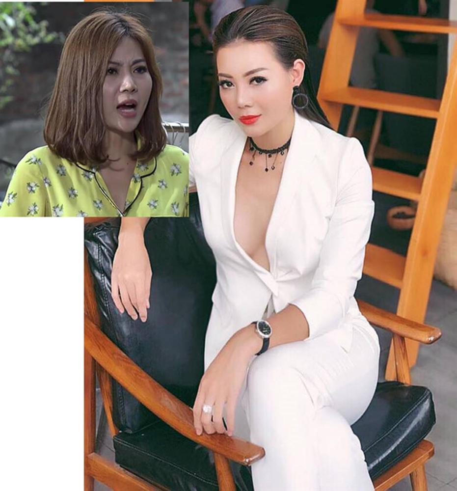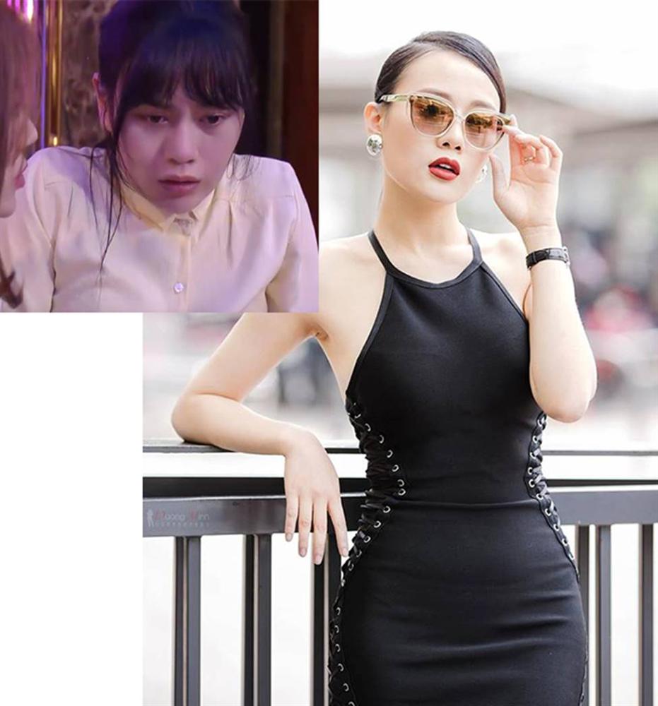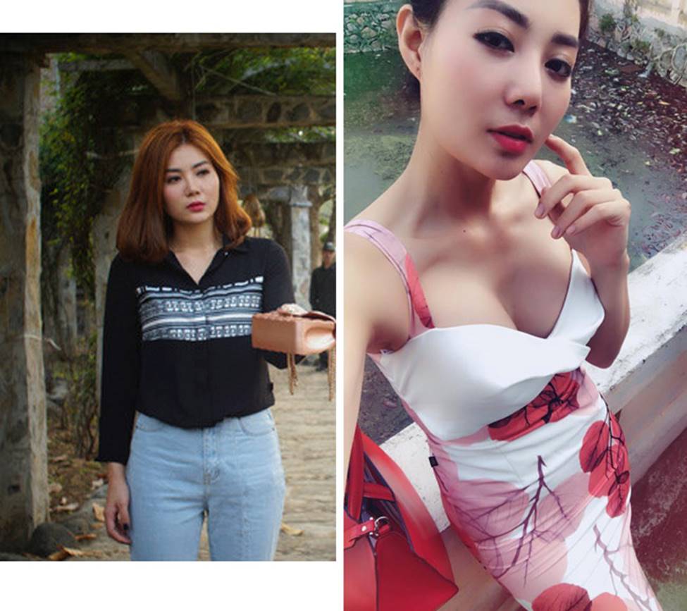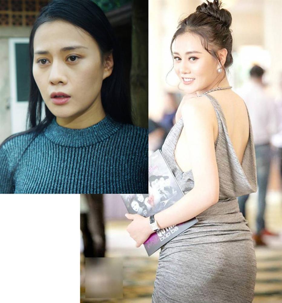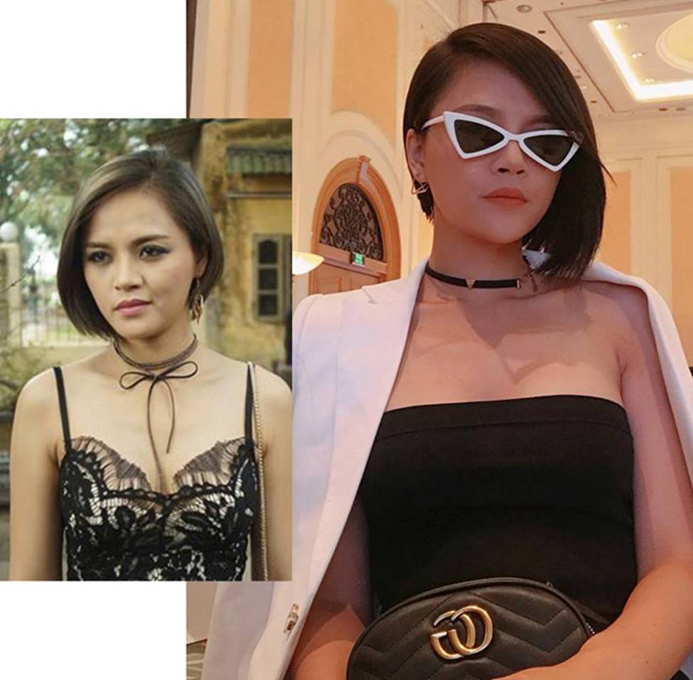 Trong khi cô nàng mặc kín cổng cao tường trong phim thì ngoài đời, Thanh Hương (ảnh phải) mặc hút hồn khác hẳn.