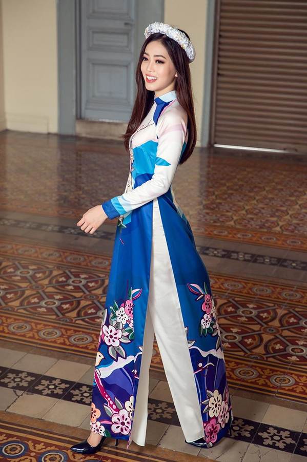 Á hậu Phương Nga rực rỡ và xinh đẹp trong tà áo dài thêu hoa đào.