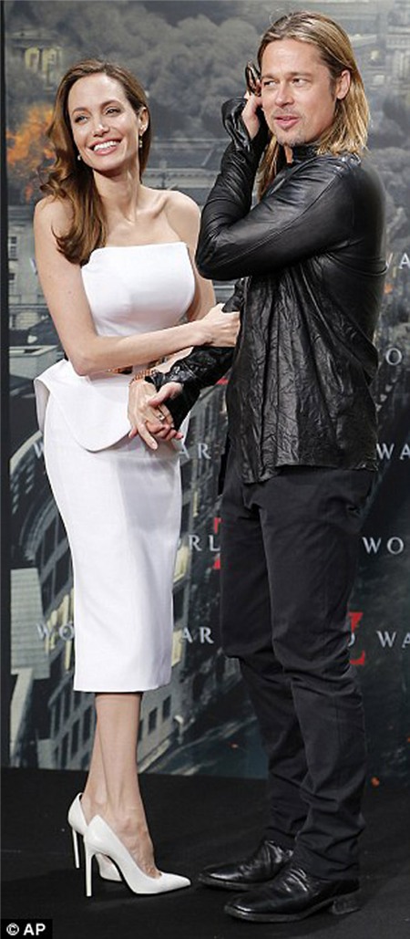Có mặt tại Berlin, Đức để quảng bá cho bộ phim "World War Z", người đẹp 38 tuổi, Angelina Jolie đẹp mê hồn trong bộ trong bộ váy peplum quây thiết kế tinh tế. Chiếc váy trắng khiến cô rạng ngời và luôn toát lên vẻ thuần khiết.