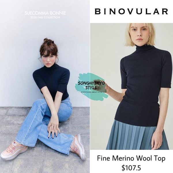 Song Hye Kyo diện mẫu áo thun dáng ôm của Binovular cùng jeans ống vẩy cạp cao, đi kèm với đó là kiểu tóc búi cao với phần mái ngang đậm chất thập niên 60. Dù diện 1 mẫu sản phẩm tầm trung nhưng "bà Song" đã mang tới vẻ ngoài cổ điển thật cuốn hút!
