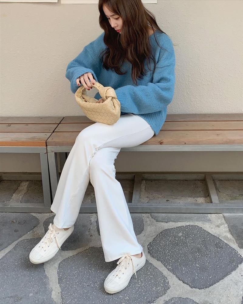 Quần trắng là mảnh ghép không nên thiếu trong tủ đồ của mọi chị em. Ưu điểm của mẫu quần này là sự nhẹ nhàng, trang nhã, gần như có thể kết hợp với mọi kiểu áo mà chị em đang có sẵn. Khi quần trắng kết hợp với áo len, combo này sẽ tạo nên set trang phục thanh lịch, trẻ trung. Để vẻ ngoài thêm phần nổi bật thì thay vì mix quần trắng với áo màu trung tính, chị em hãy kết hợp item này với áo màu mè một chút nhé, đảm bảo vẻ ngoài sẽ rất sáng sủa, trẻ trung.