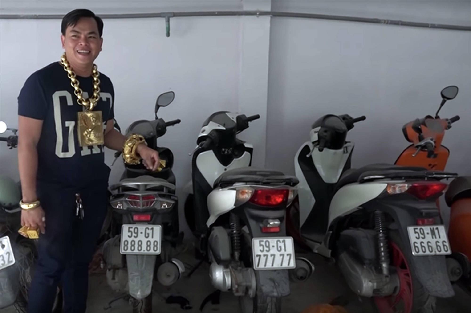 Thậm chí, chiếc xe mạ vàng mà Phúc XO dùng để di chuyển ngoài đường với đội ngũ bảo vệ lớn cũng không phải là xe của mình mà là xe đi thuê với giá gần 1 triệu đồng/ngàyVà dàn xe gắn máy có biển kiểm soát ngũ quý cực độc cũng là biển số giả, đã bị cà lại số máy, số khung...