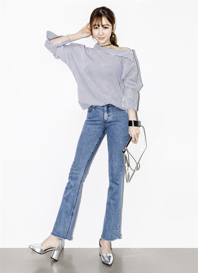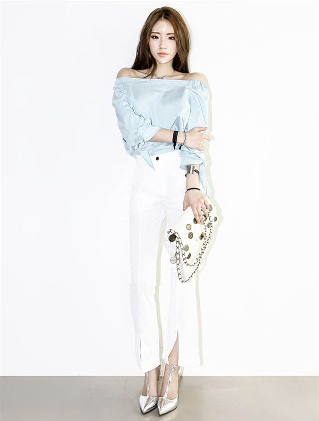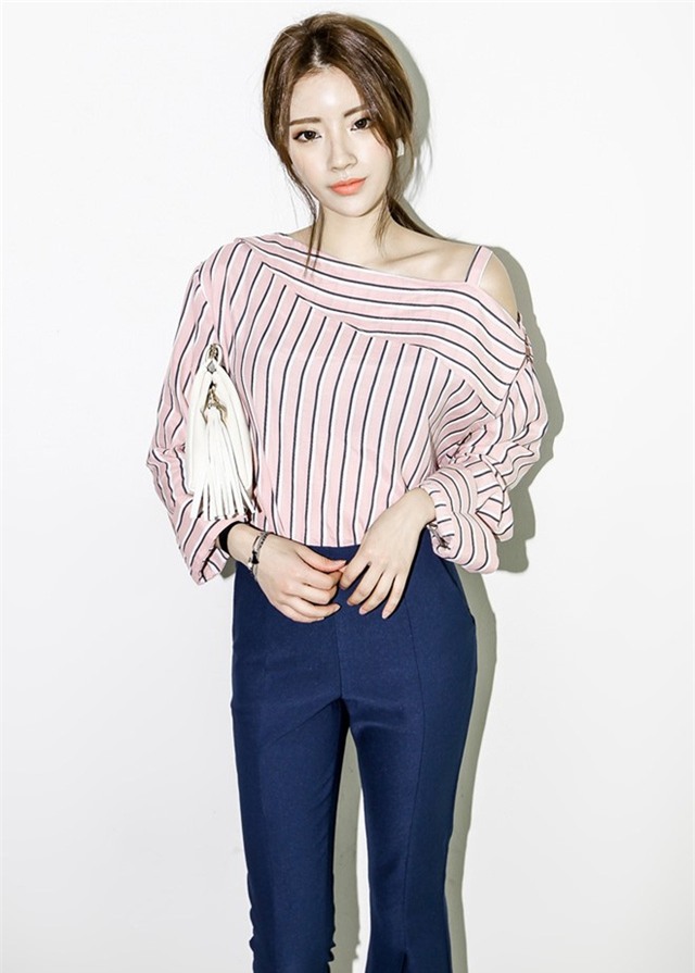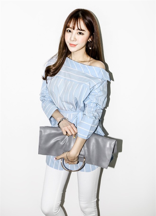 Nhờ biến tấu áo trễ vai mà kiểu dáng sơ mi trở nên thật cá tính và ấn tượng.