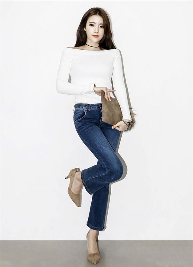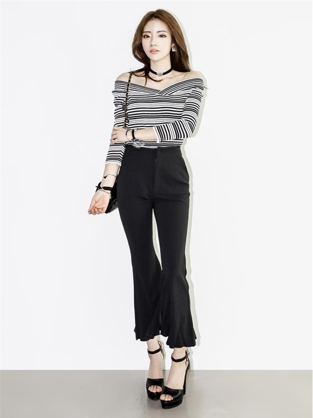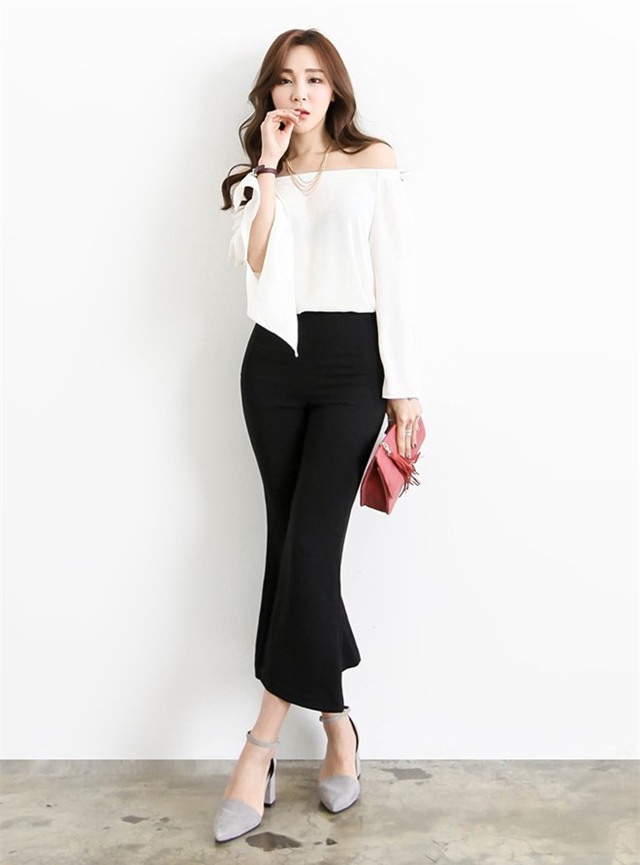 Gợi ý với crop top trễ vai kết hợp quần ống loe nhẹ nhàng.