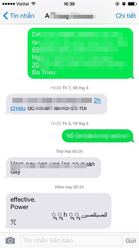 một tin nhắn SMS với các ký tự lạ bằng tiếng Ả Rập như chúng ta có thể