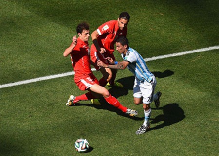 Di Maria trước sự truy cản của 2 tuyển thủ Thụy Sĩ |