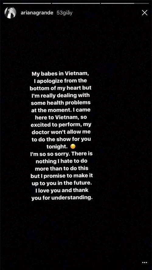 Trước thềm diễn ra liveshow vào chiều tối ngày 23/4, Ariana Grande bất ngờ đăng tải lên dòng trạng thái Instagram thông báo cô huỷ bỏ concert tối nay vì lý do sức khỏe. Sự việc khiến người hâm mộ cũng như các nghệ sĩ tại Việt Nam cảm thấy rất hoang mang và bị thiếu tôn trọng.