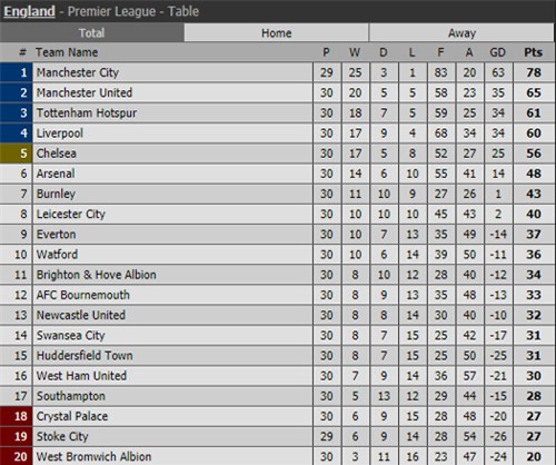 BXH Premier League sau các trận đã kết thúc ở vòng 30.