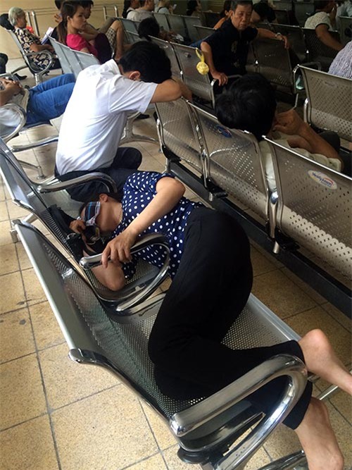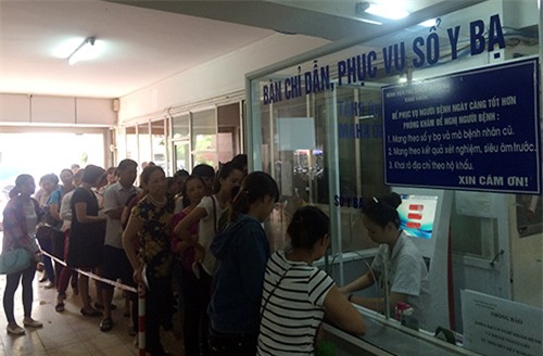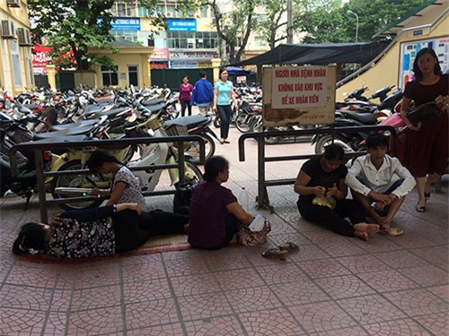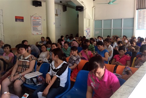 Theo ghi nhận của phóng viên tại Bệnh viện Phụ sản Trung ương (Hai Bà Trưng, Hà Nội), những ngày này luôn đông nghịt bà bầu tới để khám thai. Bệnh viện đông đúc, không còn chỗ ngồi; các bà bầu vạ vật ở hành lang, dưới gốc cây râm mát chờ tới lượt khám bệnh trong thời tiết nắng nóng. Trên khuôn mặt ai cũng lộ rõ vẻ mệt mỏi vì phải chờ đợi, xếp hàng.