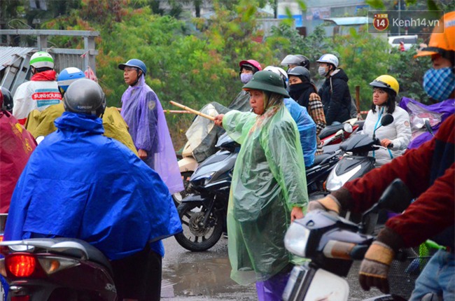Trong dòng người đông đúc đang cố nhích từng bước, một người phụ nữ mang chiếc áo mưa mỏng, tay cầm chiếc gậy tre, miệng ngậm chiếc còi đã nhanh chóng đứng ra phân luồng, điều tiết giao thông.