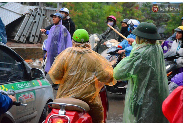 Khoác vội chiếc áo mưa, bà Tiến nhanh nhẹn chạy đến khu vực đang tắc nghẽn, tay cầm gậy tre, miệng thổi còi hướng dẫn đám đông di chuyển.