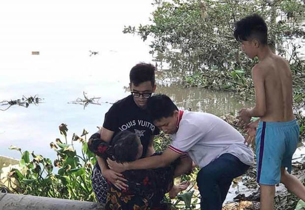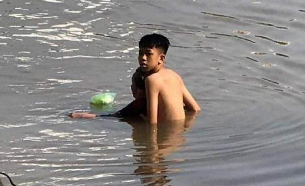Em Phạm Văn Tú dũng cảm lao xuống sông cứu sống cụ bà hơn 70 tuổi bị đuối nước (hình ảnh được người chứng kiến chụp lại và chia sẻ trên mạng xã hội).