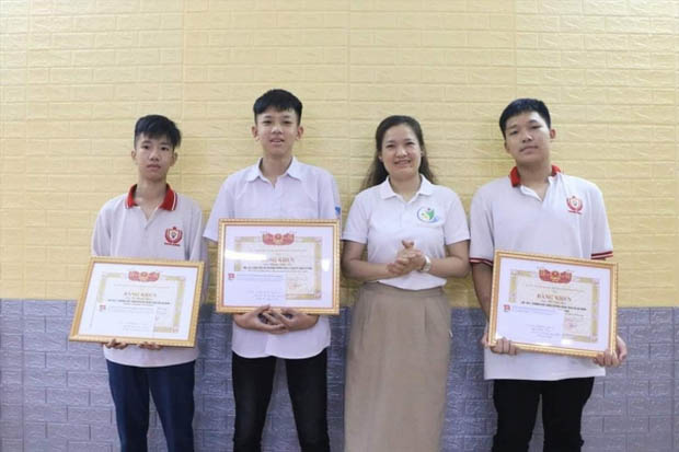 Bí thư Thành Đoàn Hải Phòng Vương Toàn Thu Thủy (thứ hai từ phải sang) trao Bằng khen tặng các học sinh có hành động dũng cảm.