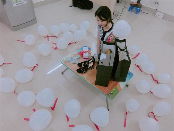 Cô mở cửa phòng từ từ bước ra với khuôn mặt tươi cười rạng rỡ, bước đến bên những hộp quà đã được bọc sẵn trên bàn, xung quanh căn phòng trang trí đầy bóng bay.