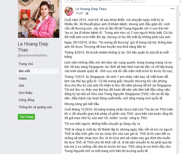 Tiếp theo diễn biến vụ ly hôn vợ chồng ông chủ Tập đoàn Trung Nguyên, mới đây trên trang Facebook của bà Lê Hoàng Diệp Thảo, vợ "Vua cà phê" tiếp tục có những chia sẻ về sức khỏe tâm thần của ông Đặng Lê Nguyên Vũ. Đồng thời bà Thảo cũng tiết lộ những sóng gió phải đối mặt khi điều hành công ty con của Trung Nguyên tại Singapore.