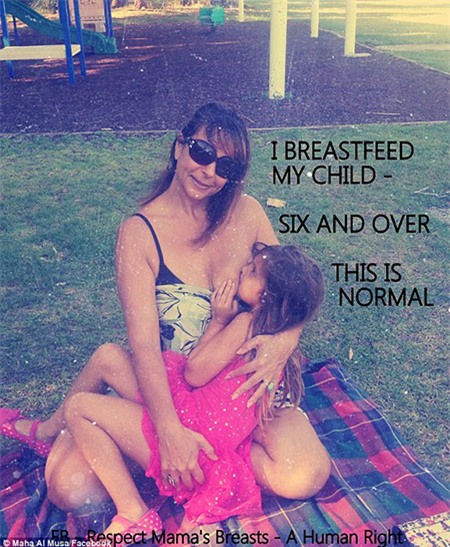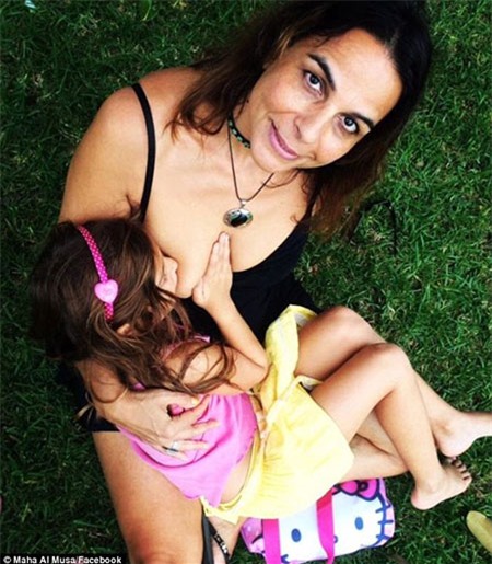 Maha Al Musa, năm nay 52 tuổi, hiện đang sống tại Byron Bay, New South Wales (Australia) đã gây chú ý với bộ ảnh cho con gái, vẫn mặc đồng phục đi học, bú sữa mẹ trong công viên. Cô Al Musa cho biết con gái Aminah năm nay 6 tuổi nhưng vẫn thường xuyên bú sữa mẹ.