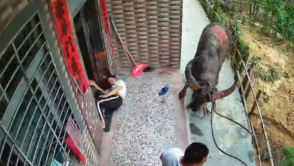 Em bé bị rơi khỏi tay mẹ và lăn xuống đất, còn người phụ nữ thì bị húc bắn vào tường. Cô hoảng loạn la hét và cố dùng chân đạp con trâu ra xa trong vô vọng.