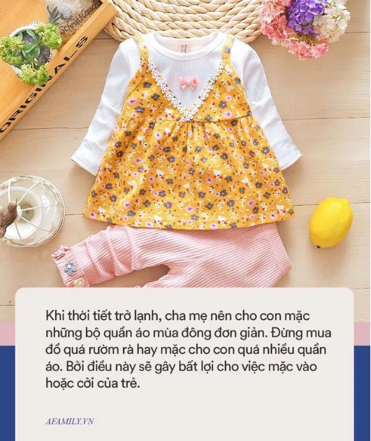 Khi thời tiết trở lạnh, cha mẹ nên cho con mặc những bộ quần áo mùa đông đơn giản. Đừng mua đồ quá rườm rà hay mặc cho con quá nhiều quần áo. Bởi điều này sẽ gây bất lợi cho việc mặc vào hoặc cởi của trẻ.