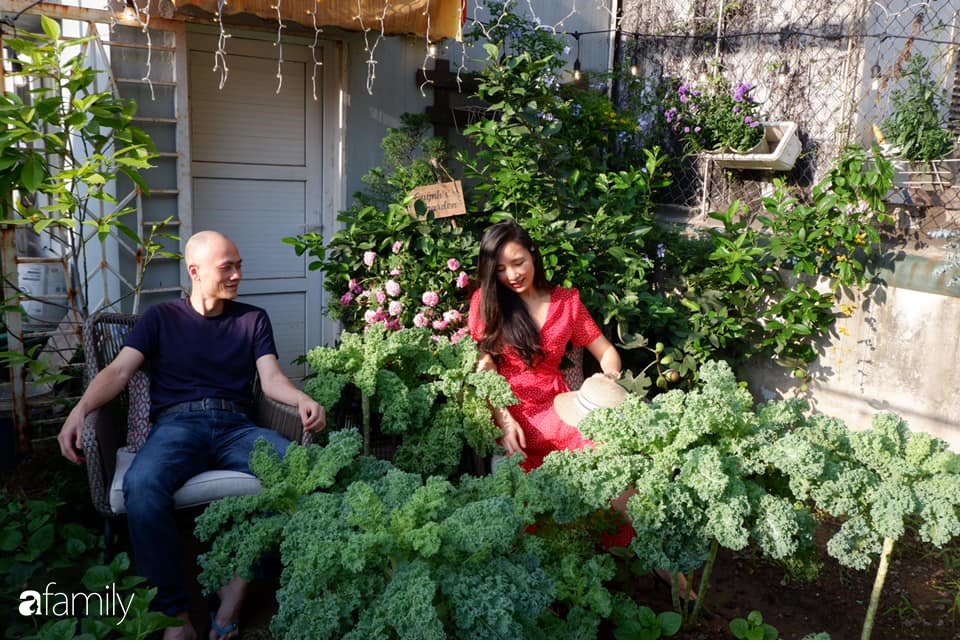 Chị Quỳnh Sourdough và chồng tại khu vườn trên sân thượng của gia đình.