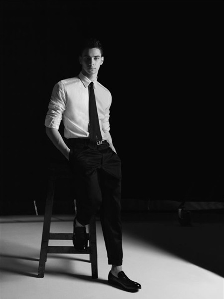 Sciglio bảnh bao với bộ trang phục quần đen, áo trắng và thắt cà vạt. |