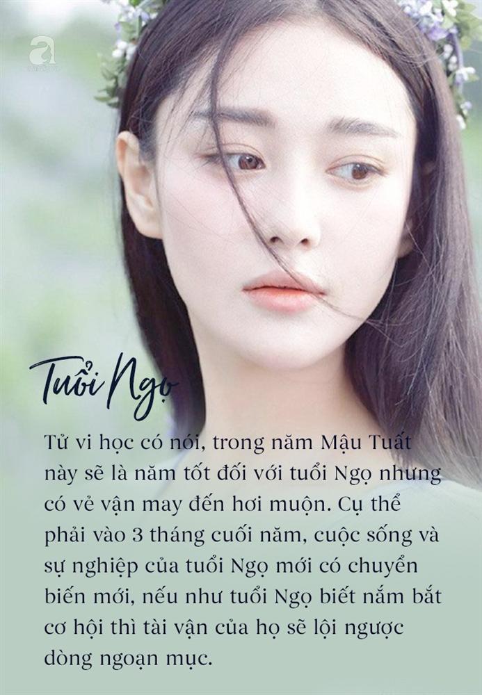 Trời sinh tuổi Ngọ là những người có tính cách mạnh mẽ, độc lập và thích tự do. Trong công việc, tuổi Ngọ luôn muốn có sự cạnh tranh để đạt được hiệu quả tốt nhất. Họ có trách nhiệm với công việc, không muốn tụt lại phía sau, tuy nhiên trong những năm gần đây, vì vận may chưa đến nên tuổi Ngọ không thể có bước đột phá trong sự nghiệp. Tử vi học có nói, trong năm Mậu Tuất này sẽ là năm tốt đối với tuổi Ngọ nhưng có vẻ vận may đến hơi muộn. Cụ thể phải vào 3 tháng cuối năm, cuộc sống và sự nghiệp của tuổi Ngọ mới có chuyển biến mới. Đặc biệt, đây là khoảng thời gian hoàng kim và là thời cơ tốt để kinh doanh đầu tư, nếu như tuổi Ngọ biết nắm bắt cơ hội thì tài vận của họ sẽ lội ngược dòng ngoạn mục, việc làm giàu chỉ trong tầm tay. Dự kiến, cuối năm sẽ tạo dựng khối tài sản to lớn, không còn phiền muộn cơm áo gạo tiền, chỉ sợ tiền tiêu mãi không hết.