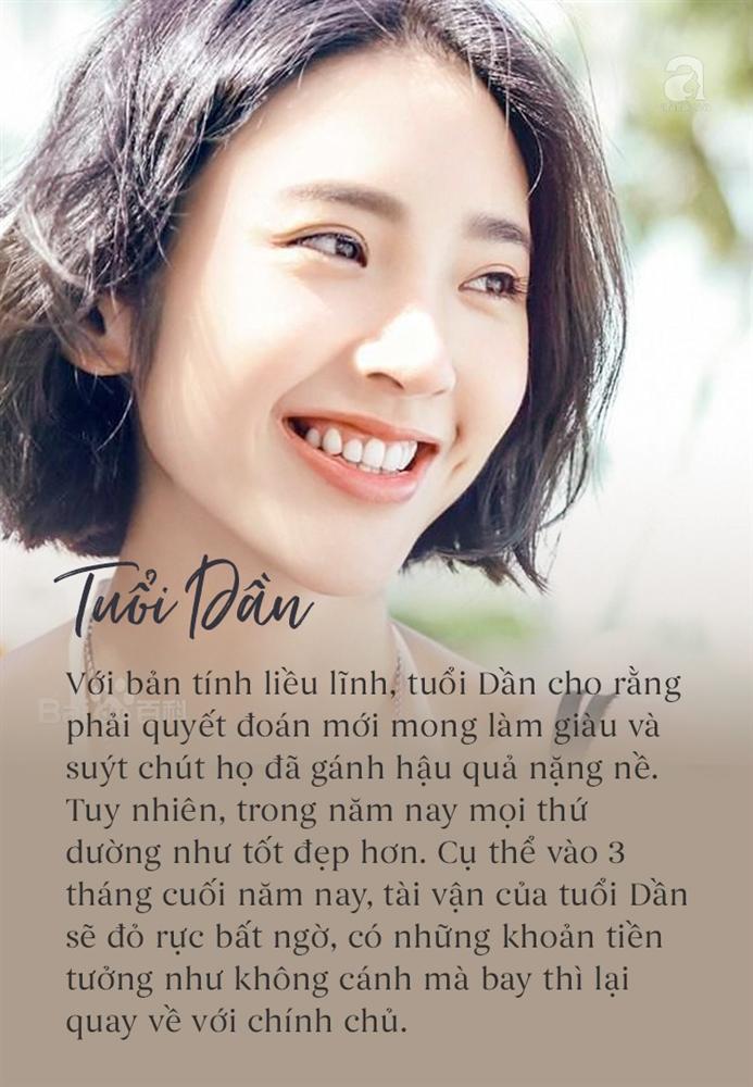 Tuổi Dần là một trong số những con giáp có cuộc sống khá thăng trầm và phức tạp. Trời sinh tuổi Dần có tính cách độc lập, tham vọng và luôn mong muốn tự tay mình xây dựng cuộc sống trong mơ. Tuy nhiên, do sự vội vã mà tuổi Dần chưa thể gặt hái được thành công. Trong những năm trước, tuổi Dần đã phải đối mặt với nhiều khó khăn trong cuộc sống, trong đó vấn đề tài chính là một trong những vấn đề lớn. Với bản tính liều lĩnh, tuổi Dần cho rằng phải quyết đoán mới mong làm giàu và suýt chút họ đã gánh hậu quả nặng nề. Tuy nhiên, trong năm nay mọi thứ dường như tốt đẹp hơn. Cụ thể vào 3 tháng cuối năm nay, tài vận của tuổi Dần sẽ đỏ rực bất ngờ, có những khoản tiền tưởng như không cánh mà bay thì lại quay về với chính chủ. Không những thế, tuổi Dần còn gặp được cơ hội vàng, giúp họ gầy dựng sự nghiệp vững vàng hơn, từ đó thu được nhiều lợi nhuận hơn. Dự kiến, cuối năm tài sản tăng lên đáng kể, dư dả thoải mái sống đến năm sau.