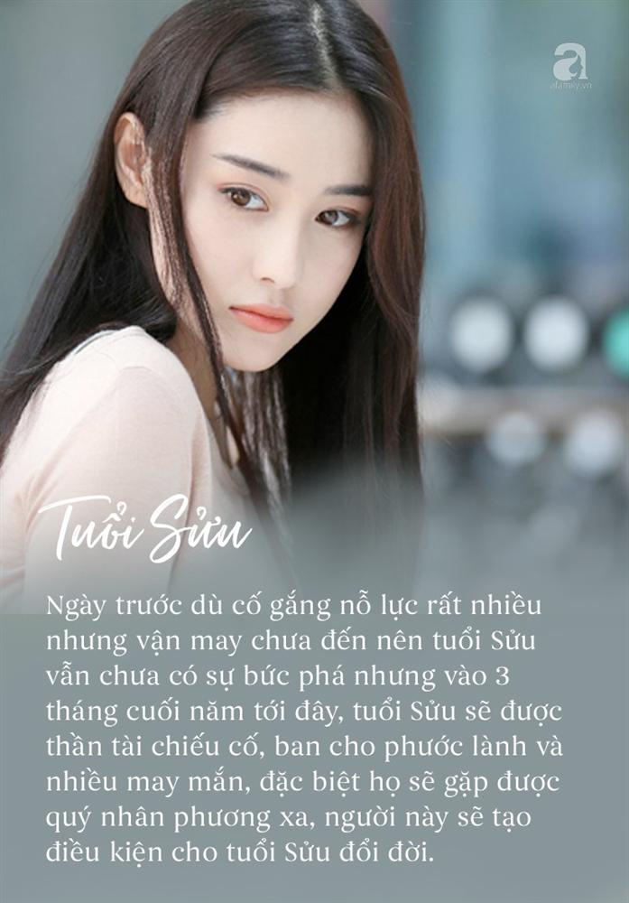 Trong số 12 con giáp, tuổi Sửu là những người sống thực tế, không tham vọng và luôn chăm chú vào công việc của chính mình. Tuổi Sửu luôn tâm niệm một điều, cuộc sống nghèo khó hay sung sướng đều do mình tạo ra, vì vậy họ chưa một lần ngơi tay và luôn hy vọng sẽ có thể xây dựng được cuộc sống sung túc đầy đủ. Ngày trước dù cố gắng nỗ lực rất nhiều nhưng vận may chưa đến nên tuổi Sửu vẫn chưa có sự bức phá, tuy nhiên họ vẫn giữ được tinh thần lạc quan, có trách nhiệm với công việc và hy vọng vào ngày mai tươi sáng. Vào 3 tháng cuối năm tới đây, tuổi Sửu sẽ được thần tài chiếu cố, ban cho phước lành và nhiều may mắn, đặc biệt họ sẽ gặp được quý nhân phương xa, người này sẽ tạo điều kiện cho tuổi Sửu đổi đời, nếu biết nắm bắt thì từ năm sau sẽ không còn vất vả.