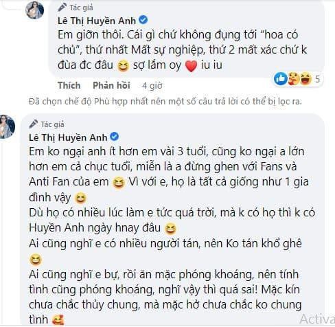 Mới đây, Bà Tưng đăng đàn: 'Tìm người yêu cho cô gái trong ảnh'. Huyền Anh cũng có những tiêu chí riêng như không đụng 'hoa có chủ'. Hoặc: 'Em không ngại anh ít hơn em vài 3 tuổi, cũng không ngại anh lớn hơn em cả chục tuổi, miễn là anh đừng ghen với fans và anti fan của em. Vì với em, họ là tất cả giống như 1 gia đình vậy. Dù họ có nhiều lúc làm em tức quá trời, mà không có họ thì không có Huyền Anh ngày hôm nay đâu'.
