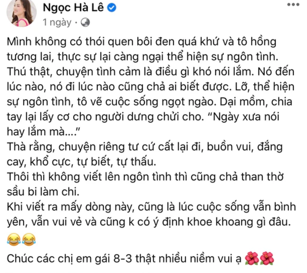 Rạng sáng 19/4, Ngọc Hà - bà xã nghệ sĩ Công Lý khiến khán giả xôn xao với story đăng tải trên Facebook cá nhân. Cụ thể, cô viết: "Có những con người ác thật sự! Và quá tồi tệ". Qua những dòng chữ này có thể thấy sự tức giận và phẫn nộ của Ngọc Hà. Tuy nhiên, bà xã Công Lý không chia sẻ cụ thể thêm về câu chuyện này. Người hâm mộ cũng không biết Ngọc Hà đang nhắn nhủ, bày tỏ thái độ chỉ trích này tới ai.
