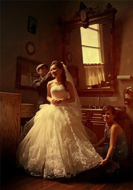 Cha và em gái giúp Thủy Tiên chỉnh sửa trang phục lần cuối cùng trước khi tiến vào lễ đường trong ngày cưới. |