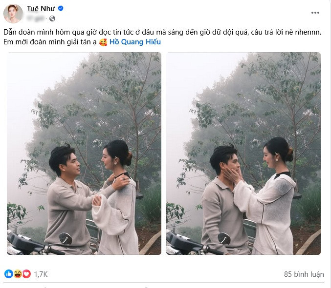 Tuy nhiên, bà xã Hồ Quang Hiếu đã có hành động đáp trả. Theo đó, trên trang cá nhân, người đẹp Tuệ Như đăng tải hình ảnh tình bể bình bên ông xã kèm dòng trạng thái đanh thép: "Dẫn đoàn mình hôm qua giờ đọc tin tức ở đâu mà sáng đến giờ dữ dội quá, câu trả lời nè nhen. Em mời đoàn mình giải tán ạ."