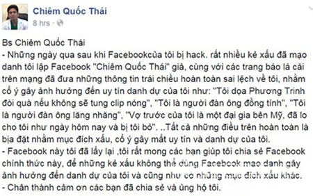 "Những ngày qua sau khi Facebook của tôi bị hack, rất nhiều kẻ xấu đã mạo danh tôi lập Facebook "Chiêm Quốc Thái" giả, cùng với các trang báo lá cải trên mạng đã đưa những thông tin trái chiều hoàn toàn sai lệch về tôi, nhằm cố ý gây ảnh hưởng đến uy tín danh dự của tôi như: "Tôi dọa Phương Trinh đòi quà nếu không sẽ tung clip nóng", "Tôi là người đàn ông đồng tính", "Tôi là người đàn ông lăng nhăng", "Vợ trước của tôi là một đại gia bên Mỹ, đã lo cho tôi như ngày hôm nay và bị tôi bỏ"... Tất cả những điều trên hoàn toàn là bịa đặt nhằm mục đích xấu, cố ý gây mất uy tín và danh dự của tôi.