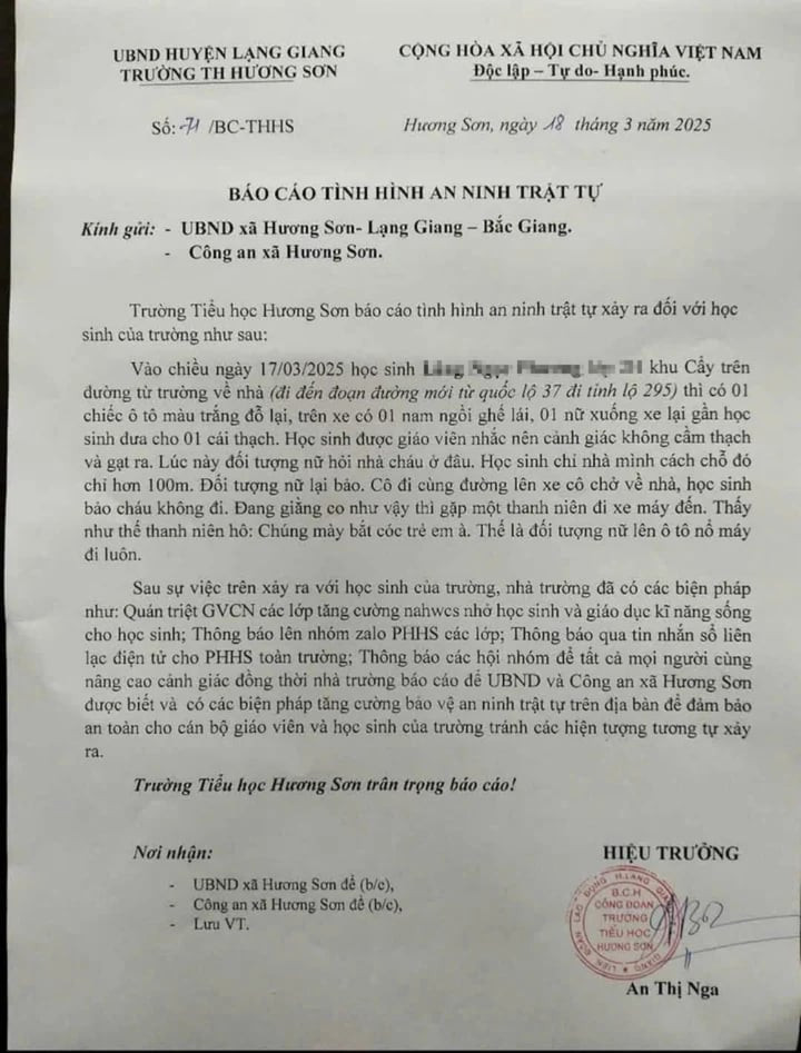 Trước đó, ngày 18/3, Công an xã Hương Sơn (huyện Lạng Giang) tiếp nhận báo cáo của Trường Tiểu học Hương Sơn khu B liên quan nghi vấn bắt cóc trẻ em.