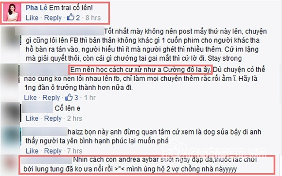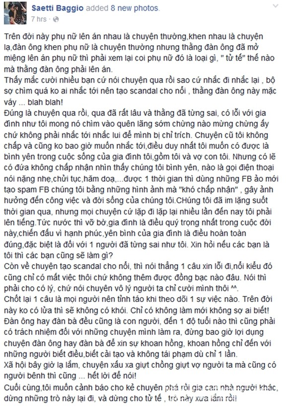 Cách đây ít giờ, Baggio lại tiếp tục chia sẻ trên trang cá nhân suy nghĩ của mình trước những lời trách móc của dân mạng, cho rằng anh là 'thằng mặc váy', 'sợ chìm quá không ai nhắc tới nên tạo scandal cho nổi'... Hơn nữa anh còn chia sẻ đoạn bình luận của bạn bè về một nhân vật nữ, người này được cho là Andrea.