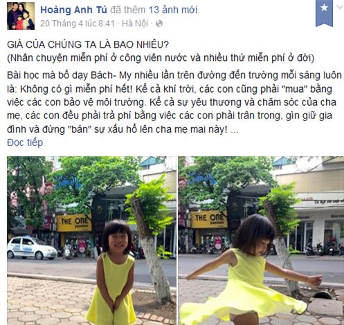 Mới đây, trên trang cá nhân của anh Hoàng Anh Tú (người thứ hai phụ trách mục Chánh Văn của báo Hoa Học trò sau ông Đoàn Công Huynh), đã chia sẻ bài viết ý nghĩa "Giá của chúng ta là bao nhiêu?". Đây là những tâm sự của một ông bố nhắc nhở hai con về những thứ miễn phí ở đời nhân chuyện miễn phí ở công viên nước Hồ Tây vừa qua.