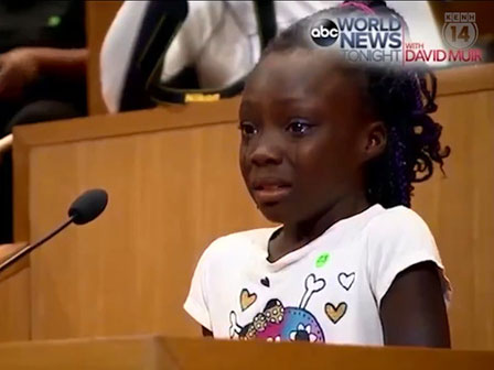 Xuyên suốt bài phát biểu của em là những giọt nước mắt, hòa trong tiếng nấc nghẹn ngào. Cô bé không chỉ thương xót cho cuộc đời mình mà còn nghẹn ngào cho cộng đồng người da màu đang phải chịu bất công trên toàn nước Mỹ.