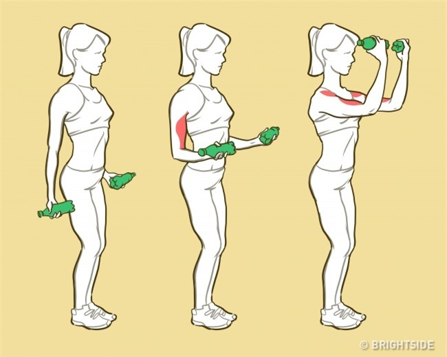 - Hai tay cầm tạ duỗi thẳng, đầu gối hơi chùng xuống, phần mông cong về phía sau (nếu không có tạ, bạn có thể thay thế bằng các chai nhựa đổ đầy nước).