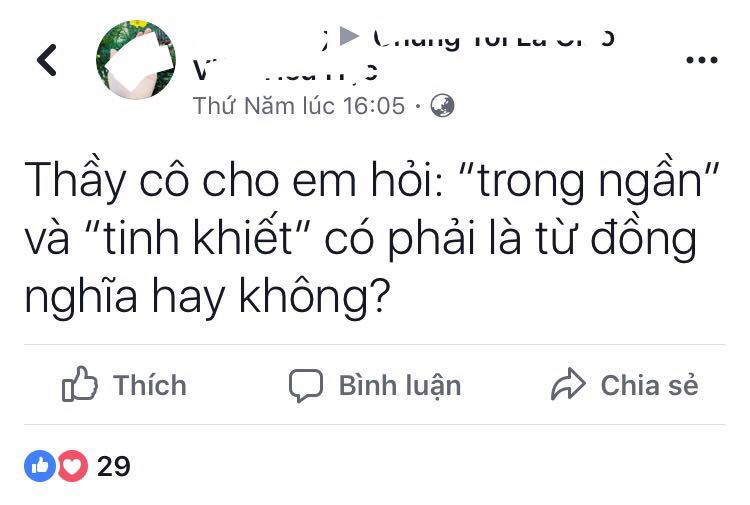 Vừa qua, một tài khoản đăng tải trên một diễn đàn về học tập có đưa ra bài tập tiếng Việt lớp 5, mong muốn tìm đáp án chính xác nhất. Câu hỏi là: “trong ngần” và “tinh khiết” có phải là từ đồng nghĩa hay không?