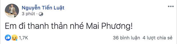 Mới đây, tin nữ diễn viên Mai Phương qua đời sau thời gian dài chống chọi với bệnh ung thu phổi khiến nhiều người bàng hoàng. Trên trang cá nhân, nhiều nghệ sĩ nhiều đồng nghiệp, bạn bè như Trịnh Kim Chi, Thanh Bình, Ninh Dương Lan Ngọc... đều không giấu được cảm xúc bàng hoàng, đau xót và gửi lời tiễn biệt, mong nữ diễn viên có thể thanh thản ra đi sau những cơn đau đớn, bệnh tật. Hiện gia đình đang chuẩn bị thủ tục để lo hậu sự cho nữ diễn viên. Thời gian và địa điểm diễn ra tang lễ sẽ được thông báo sau.