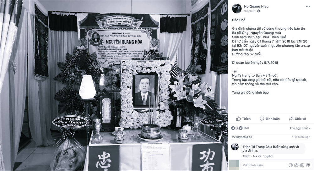 Thông tin ba qua đời được ca sĩ Hồ Quang Hiếu chia sẻ đến rộng rãi bạn bè, người hâm mộ trên trang cá nhân sáng 3/7.