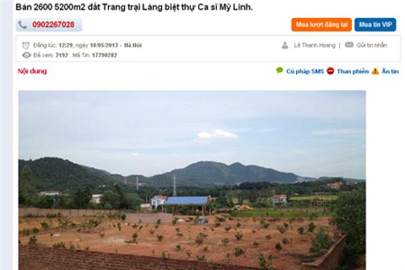 Một mẩu tin rao bán đất gắn mác gần biệt thực của ca sĩ Mỹ Linh mới được đăng tải gần đây. Ảnh chụp màn hình |
