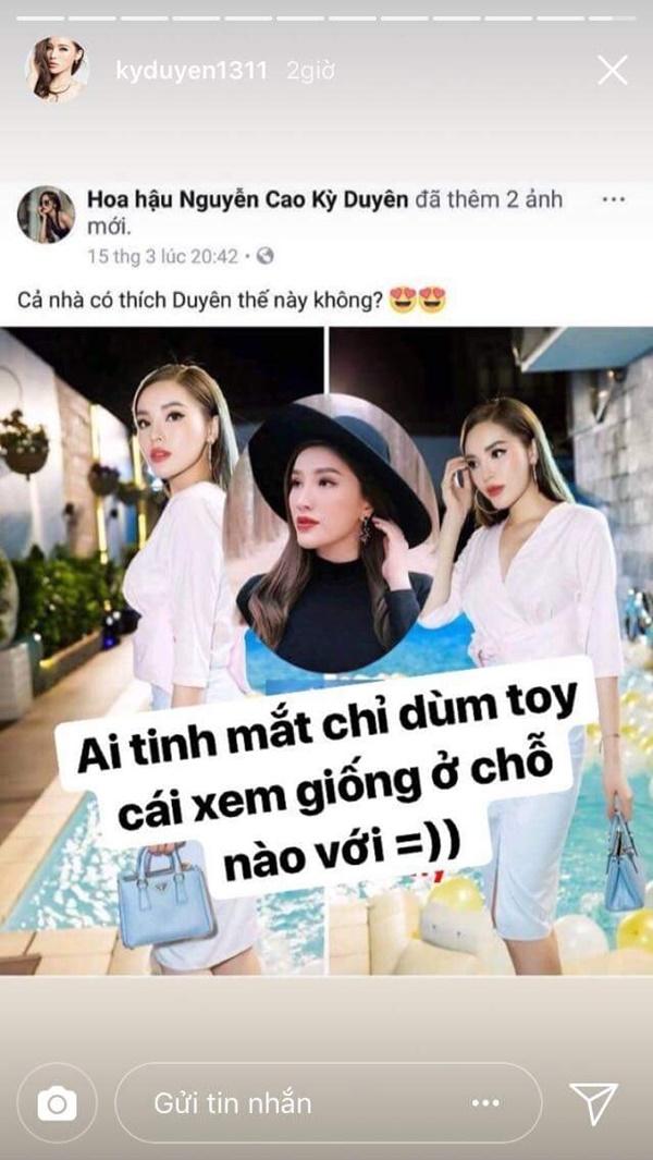 Bên cạnh đó, trên Instagram Hoa hậu Việt Nam 2014 đăng tải hình ảnh cô và nữ ca sĩ Bảo Thy cùng dòng ẩn ý: "Ai tinh mắt chỉ dùm tôi cái xem giống ở chỗ nào với". Hành động đáp trả mạnh mẽ của cô nàng gây bất ngờ cho người hâm mộ. Nguyên do từ trước tới nay, Kỳ Duyên luôn giữ cho mình sự bình tĩnh với những scandal hay lùm xùm từ phía antifan.