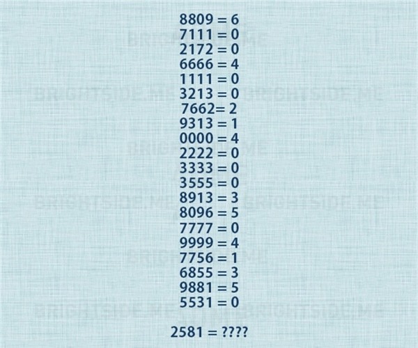 Lý giải: Bạn hãy thử đếm số vòng tròn trong mỗi chữ số thuộc cùng một số là sẽ biết ngay đáp án. Ví dụ như số 6 có 1 vòng tròn, số 8 có 2 vòng tròn, như vậy số 6889 sẽ có 6 vòng tròn. Bạn đã nhìn ra "bí quyết" chưa nào?