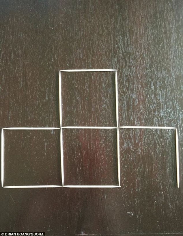 Lấy nốt que diêm của hình vuông ở giữa và xếp sang phải. Vậy là chúng ta đã có 3 hình vuông mà vẫn đủ 12 que diêm nhé.